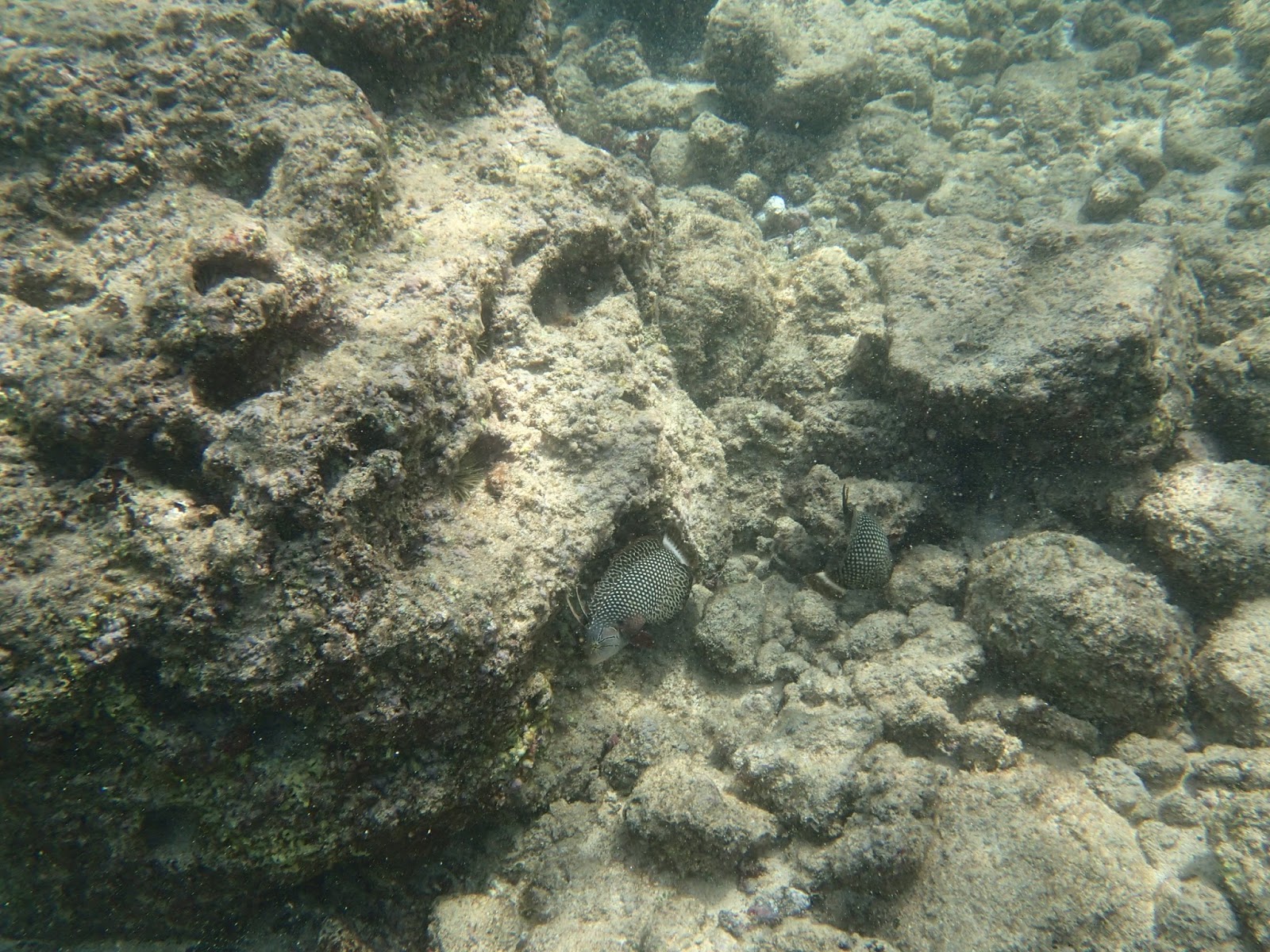 They are almost the same color as the bottom, so hope you can see both of them. They have a white band on their tails. They are quite flexible, as they often grab a rock in their mouths and throw it around. (Hence the name..) I haven't seen any other Wrasses do this. They all are quick, however, so you gotta grab the shot while you can.