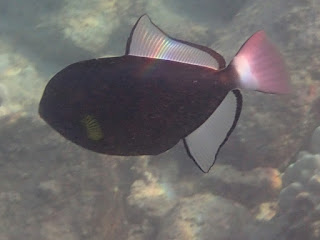 Bluefin Trevally following the goat fish. This would irritate me a lot, but the goat doesn't appear to mind. (Kinda like someone leaning over your shoulder to watch you work..)