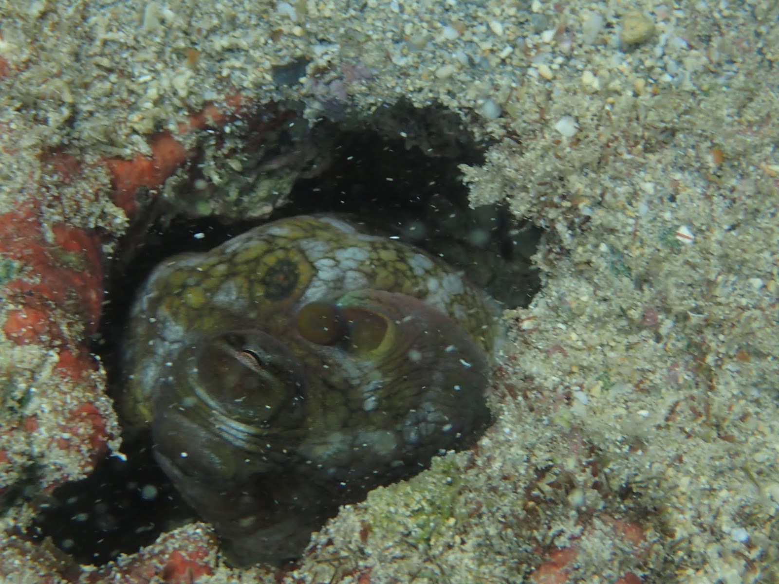 A closer photo of the octopus, which shows the sand it blew out of its den earlier.