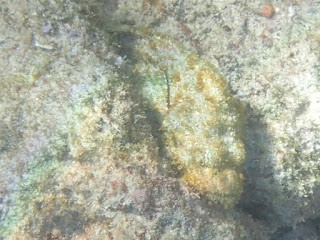 Octopus #3 is still quite a good hider...I only see it because I know generally where its den is. You can see the white siphon in the middle. There is a lot of sand in the water, as it's out near the wave break.