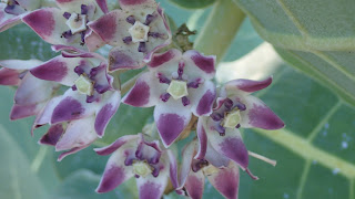 My first sighting of Monarch butterfly caterpillars, having their breakfast.